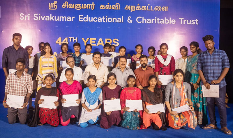 நடிகர் சிவகுமார், ஸ்ரீ சிவகுமார் கல்வி அறக்கட்டளை மூலம் 12ம் வகுப்பு பொதுத்தேர்வில் நல்ல மதிப்பெண் பெற்ற மாணவ, மாணவிகளுக்கு பரிசளித்த கெளரவித்து வருகிறார். ஒவ்வொரு ஆண்டும் தகுதியான மாணவ, மாணவிகளை அடையாளம் கண்டு, தனது அறக்கட்டளை மூலம் பாராட்டி பரிசளிக்கும் நடிகர் சிவகுமார், கடந்த 43 வருடங்களாக வெற்றிகரமாக இதனை செய்து வருகிறார். இந்த வருடம் 44 வது ஆண்டு நிகழ்வு இன்று சென்னையில் நடைபெற்றது. இதில் நடிகர் சிவகுமாரின் மகன்களும், நடிகர்களுமான சூர்யா மற்றும் கார்த்தி கலந்துக்கொண்டார்கள்.