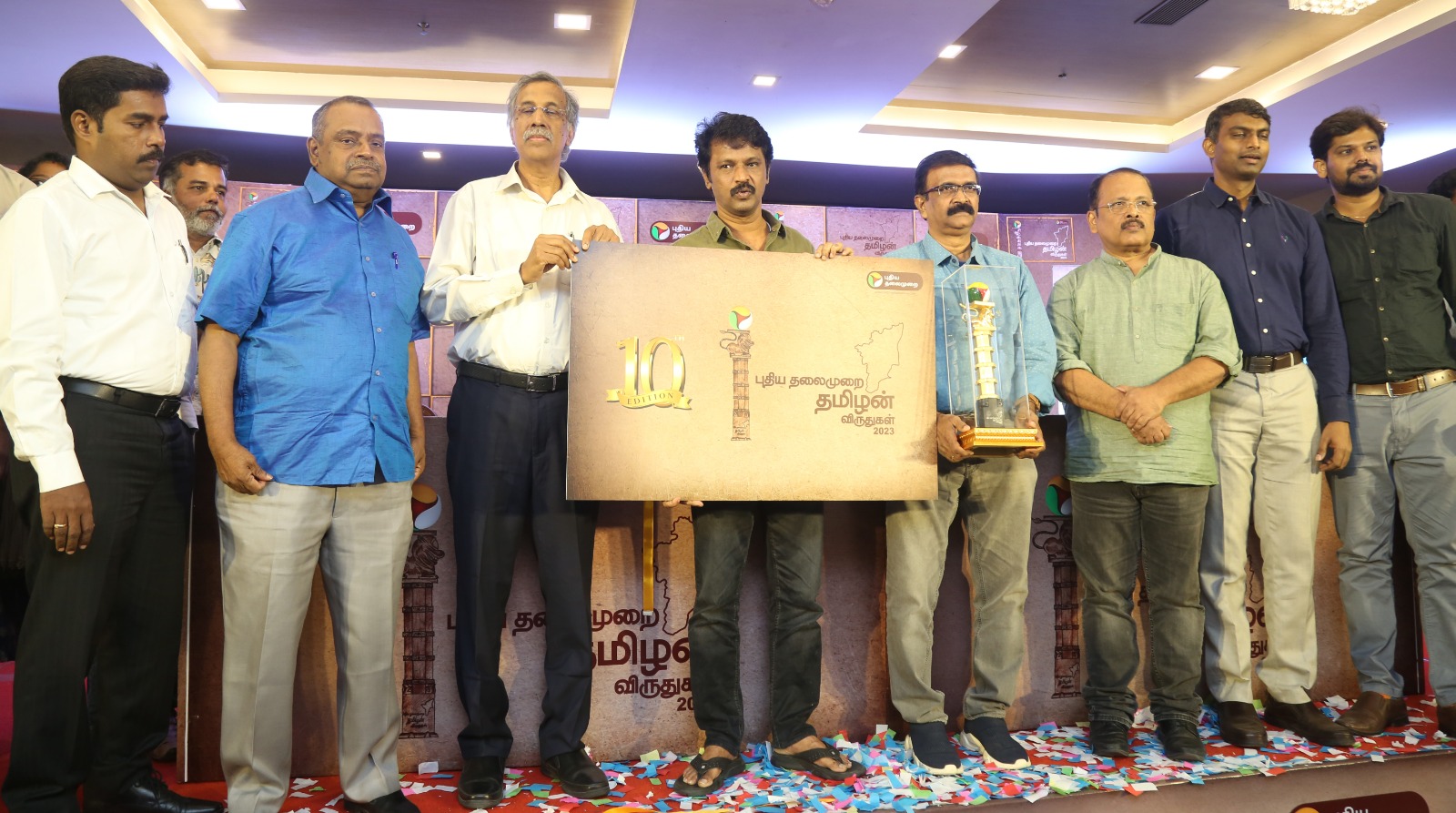 புதிய தலைமுறை தொலைக்காட்சியின் 10ஆம் ஆண்டு ‘தமிழன் விருது’ வழங்கும் விழா ; புதிய சின்னத்தை அறிமுகப்படுத்தினார் சேரன்