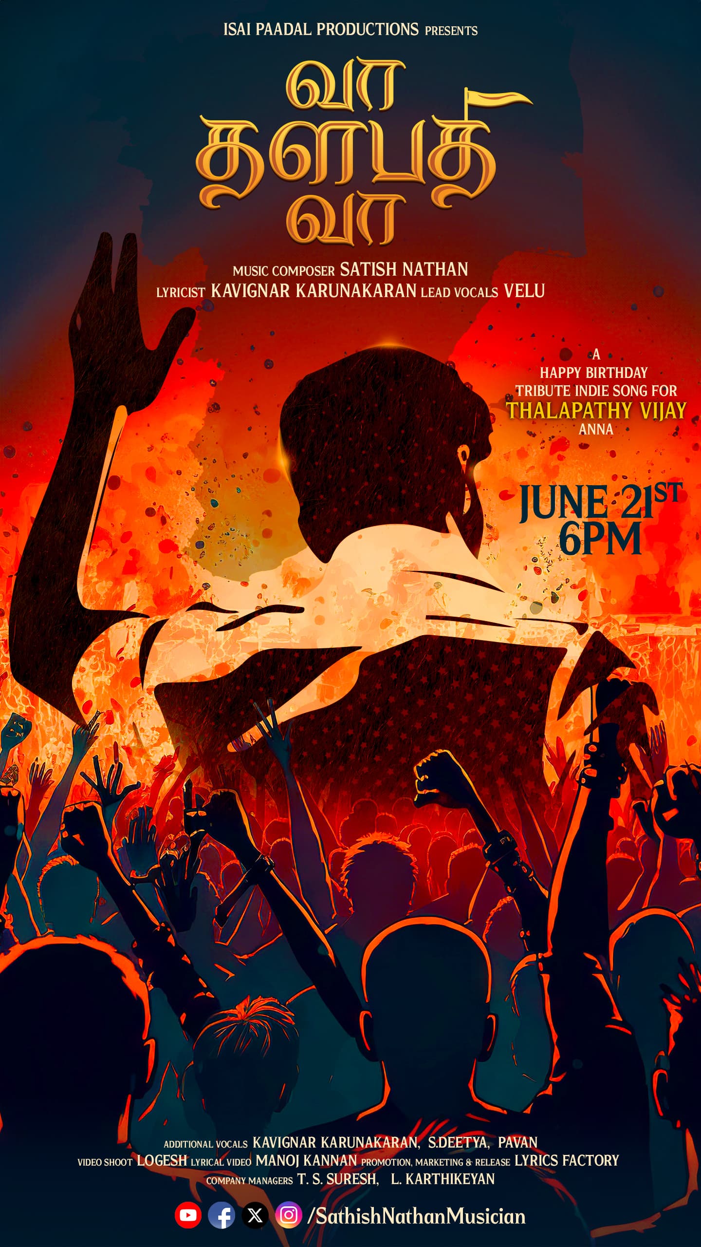 தளபதி விஜய் அவர்களின் கோடான கோடி ரசிகர்கள் ஒருவரான, வளரும் இசையமைப்பாளர் சதீஷ் நாதனின் இசையில் தளபதியின் பிறந்தநாளை முன்னிட்டு வரும் 21.6.2024 அன்று மாலை 6 மணி அளவில் ஒரு ரசிகனின் கனவாக #வாதளபதிவா என்ற தலைப்பில் பாடல் வெளியாகிறது.