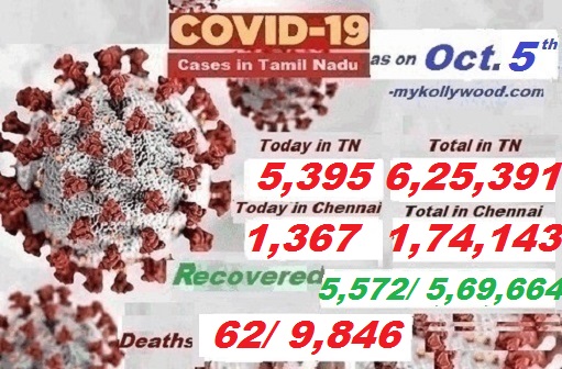 #Covid-19, #Coronavirus in Tamil Nadu – Latest News as on 5th Oct., Corona News By Vetri Venthan On Oct 9, 2020 257 Share தமிழகத்தில் கொரோனாவால் பாதிக்கப் பட்டவர்களின் எண்ணிக்கை 6,25,391-ஆக உயர்வு. இன்று மட்டும் 5,395 பேருக்கு கொரோனா பாதிப்பு உறுதிப்படுத்தப்படுள்ளது. தமிழகத்தில் ஏப்ரல் முதல் வாரத்தில் இருந்து கொரோனா பாதிக்கப்பட்டவர்களின் எண்ணிக்கை அதிகரித்த வண்ணமே இருந்தன. பாதிக்கப்பட்டவர்களின் எண்ணிக்கை 6,25,000–த்தை தாண்டியது. இன்று 5,395 பேர் புதிதாக பாதிக்கப்பட்டனர். இதில் 1,367 பேர் சென்னை சேர்ந்தவர்கள் ஆவார்கள். இதனால் சென்னையில் பாதிக்கப் பட்டவர்களின் எண்ணிக்கை 1,74,143 இன்றைய 5,395 எண்ணிக்கையுடன் ஒட்டுமொத்தமாக தமிழகத்தில் இதுவரை 6,25,391 பேர் கொரோனாவால் பாதிக்கப்பட்டுள்ளனர். இன்று 5,572 பேர் குணமடைந்து வீடு திரும்பியுள்ளனர். இதுவரை மொத்தமாக 5,69,664 பேர் குணமடைந்து வீடு திரும்பியுள்ளனர். இறப்பு –62/ 9,846 257 Share