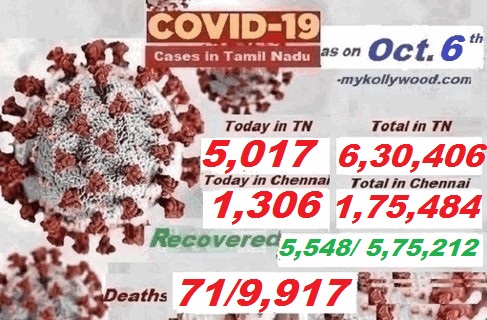 #Covid-19, #Coronavirus in Tamil Nadu – Latest News as on 6th Oct., Corona News By Vetri Venthan Last updated Oct 9, 2020 297 Share தமிழகத்தில் கொரோனாவால் பாதிக்கப் பட்டவர்களின் எண்ணிக்கை 6,30,406-ஆக உயர்வு. இன்று மட்டும் 5,017 பேருக்கு கொரோனா பாதிப்பு உறுதிப்படுத்தப்படுள்ளது. தமிழகத்தில் ஏப்ரல் முதல் வாரத்தில் இருந்து கொரோனா பாதிக்கப்பட்டவர்களின் எண்ணிக்கை அதிகரித்த வண்ணமே இருந்தன. பாதிக்கப்பட்டவர்களின் எண்ணிக்கை 6,30,000–த்தை தாண்டியது. இன்றைய 5,017 எண்ணிக்கையுடன் ஒட்டுமொத்தமாக தமிழகத்தில் இதுவரை 6,30,406 பேர் கொரோனாவால் பாதிக்கப்பட்டுள்ளனர். இன்று 5,017 பேர் புதிதாக பாதிக்கப்பட்டனர். இதில் 1,306 பேர் சென்னை சேர்ந்தவர்கள் ஆவார்கள். இதனால் சென்னையில் பாதிக்கப் பட்டவர்களின் எண்ணிக்கை 1,75,484. இன்று 5,548 பேர் குணமடைந்து வீடு திரும்பியுள்ளனர். இதுவரை மொத்தமாக 5,75,212 பேர் குணமடைந்து வீடு திரும்பியுள்ளனர். இறப்பு –71/ 9,917 297 Share